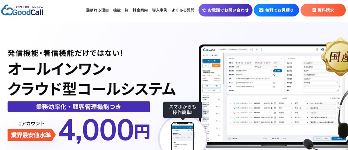 CRM・SFA・PBX・CTIが一つにまとまった、オールインワン型クラウドシステムです。コールセンター構築から電話業務の効率化まで、GoodCall一つで対応できます。
