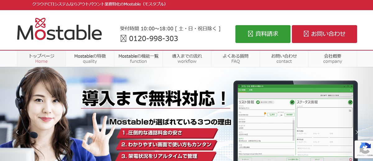 Mostableはアウトバウンドコールに特化したクラウド型CTIです。現場の声をいかした設計で、オートコールや再コールお知らせ、発信番号通知の選択などアウトバウンド業務で求められる機能が搭載されています。