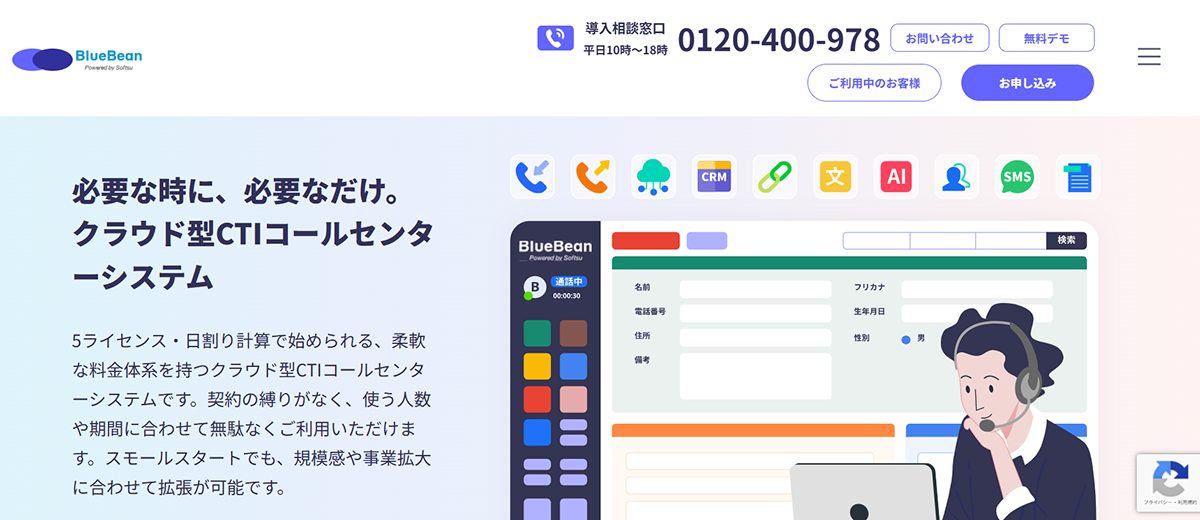 | BlueBean | 柔軟な料金設定が可能で、必要なとき・必要なだけ使用できるクラウド型CTI | 初期費用:5,000円/ライセンス |