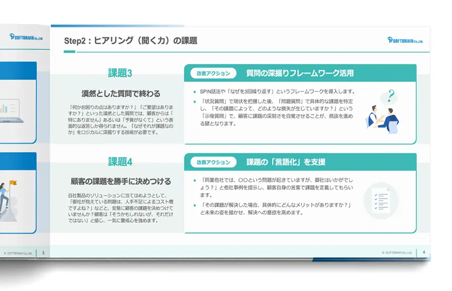 企業競争力向上のためのCRM/SFAであるesm(eセールスマネージャー)を提供するソフトブレーン株式会社(本社:東京都中央区、代表取締役社長:豊田浩文、以下「ソフトブレーン」)は、営業パーソンの成約率向上を支援する最新ノウハウ資料『トップセールスが実践する「商談の基本習慣」と即効改善アクション10選』を無料公開いたしました。「努力しているのに報われない」と感じている営業パーソンが陥りがちな10個の「課題」を特定し、トップセールスの視点に基づいた具体的な改善策をステップ形式で解説しています。